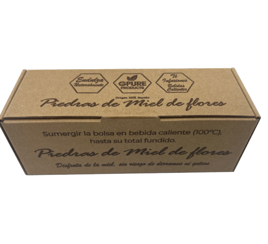 Caja expositora de 36 bolsitas de piedras de miel mixtas (miel de azahar, miel de flores y miel de castaño), para endulzar de forma natural las infusiones. Miel procedente de la Sierra de Cádiz (España), auténtica miel de calidad.